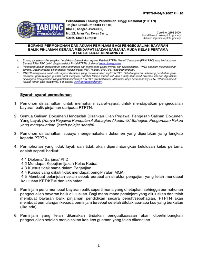 Borang Permohonan Dan Akuan Pinjaman Bagi Pengecualian Bayaran Balik Pnjaman Kelas Pertama Pin 10 Pdf